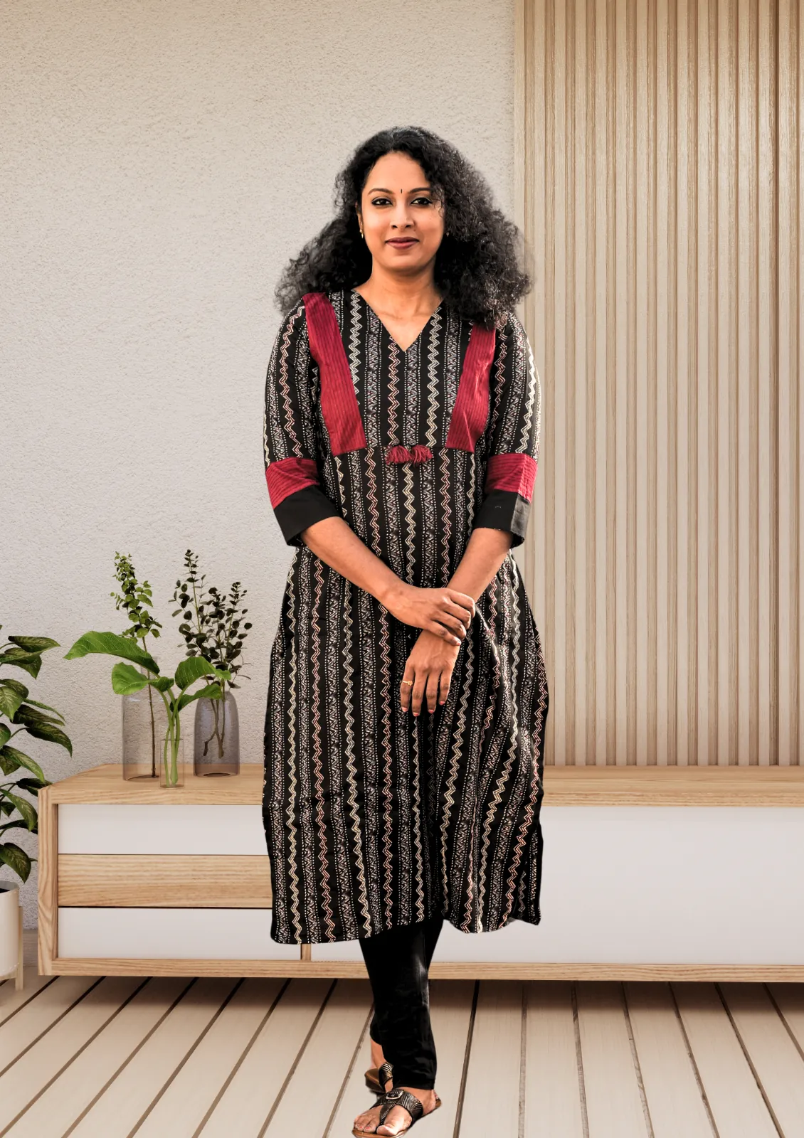 The Black Leheriya Lines Cotton Kurti combines comfort and style with its breathable fabric and striking zig-zag leheriya pattern. Designed with a straight cut, V-neck, and 3/4 sleeves, it offers a flattering fit for everyday wear. Perfect for casual outings, festive gatherings, or family occasions, this kurti is a versatile wardrobe essential.