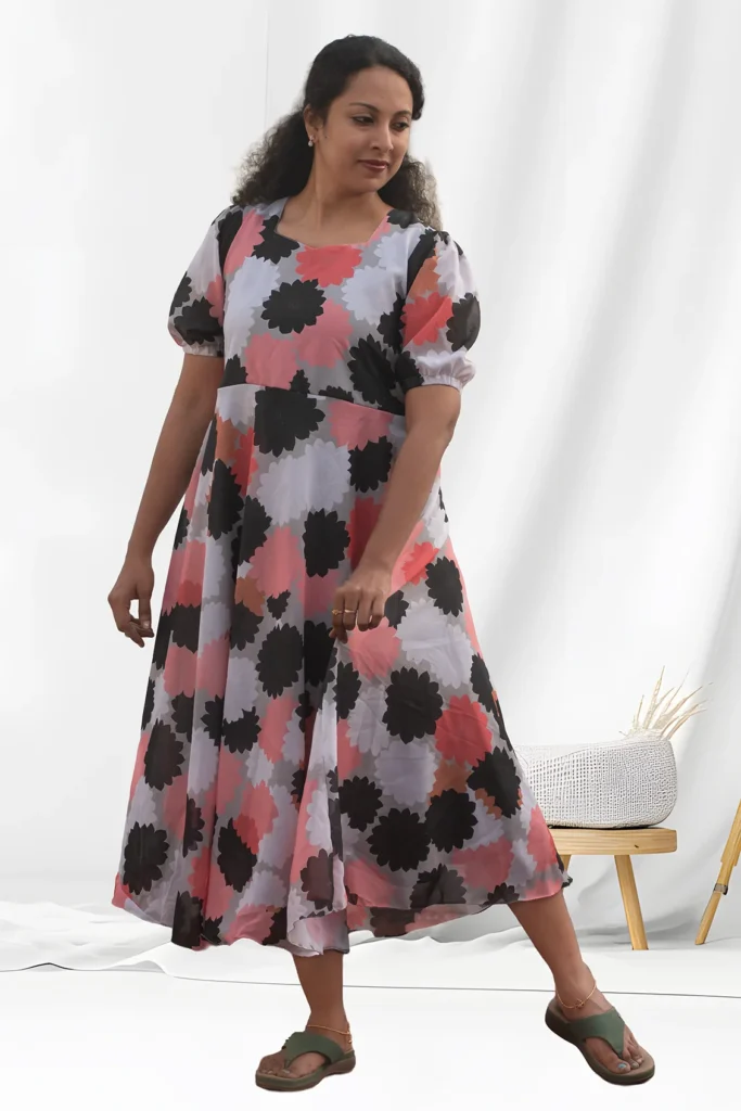 The Mugil White Petal Fit & Flare Dress in White floral georgette features a fitted bodice with a flowy Flared skirt, curved 3 Dot-Neck, and Short puff sleeves with Elasticated hem for a feminine touch. Fully crepe-lined for comfort, it offers both elegance and ease of wear. With height customization available, this versatile dress is perfect for garden parties, beach vibes ,festive gatherings, casual outings, or evening occasions.