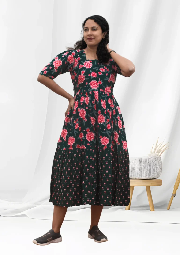 Mist Dark Green Floral Layered Midi Dress